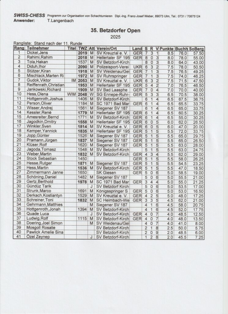 Beim Betzdorfer Open Schnellschachturnier waren insgesamt 7 Spieler vom Siegener Schachverein bei insgesamt 41 Teilnehmer vertreten. Matthies Gehrmann holte als Drittbester Jugendspieler einen Preis und Andrej Wisser erzielte mit 6,5 Punkten aus 11 Partien das beste Siegener Ergebnis.