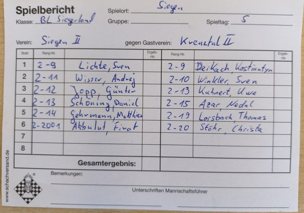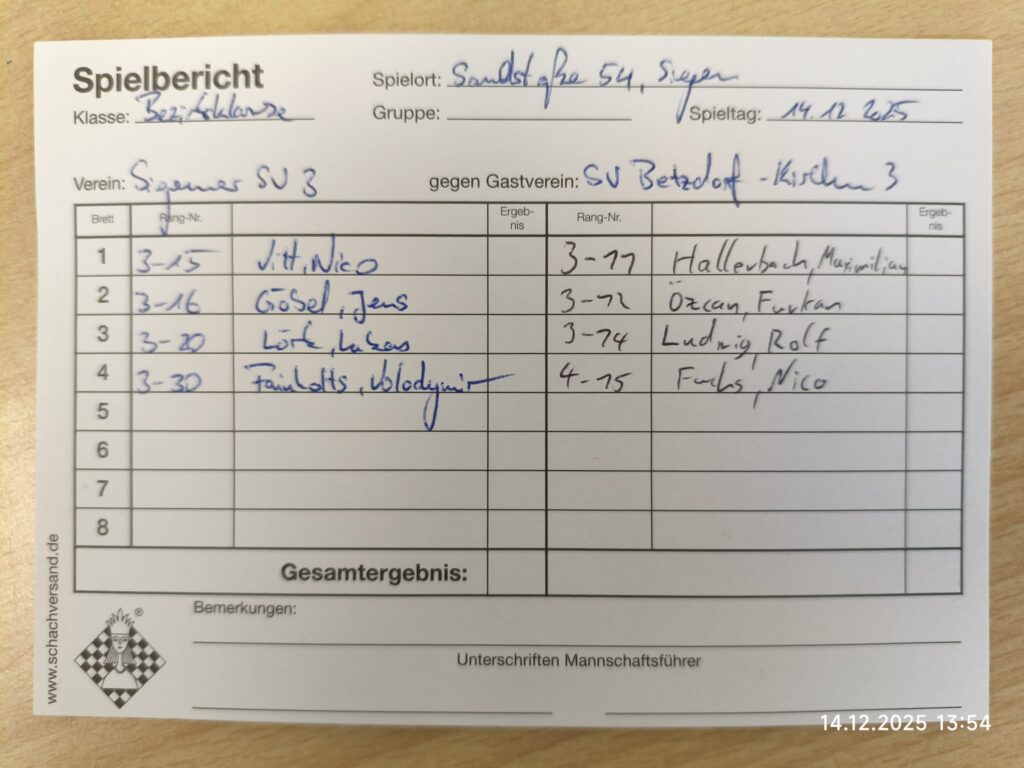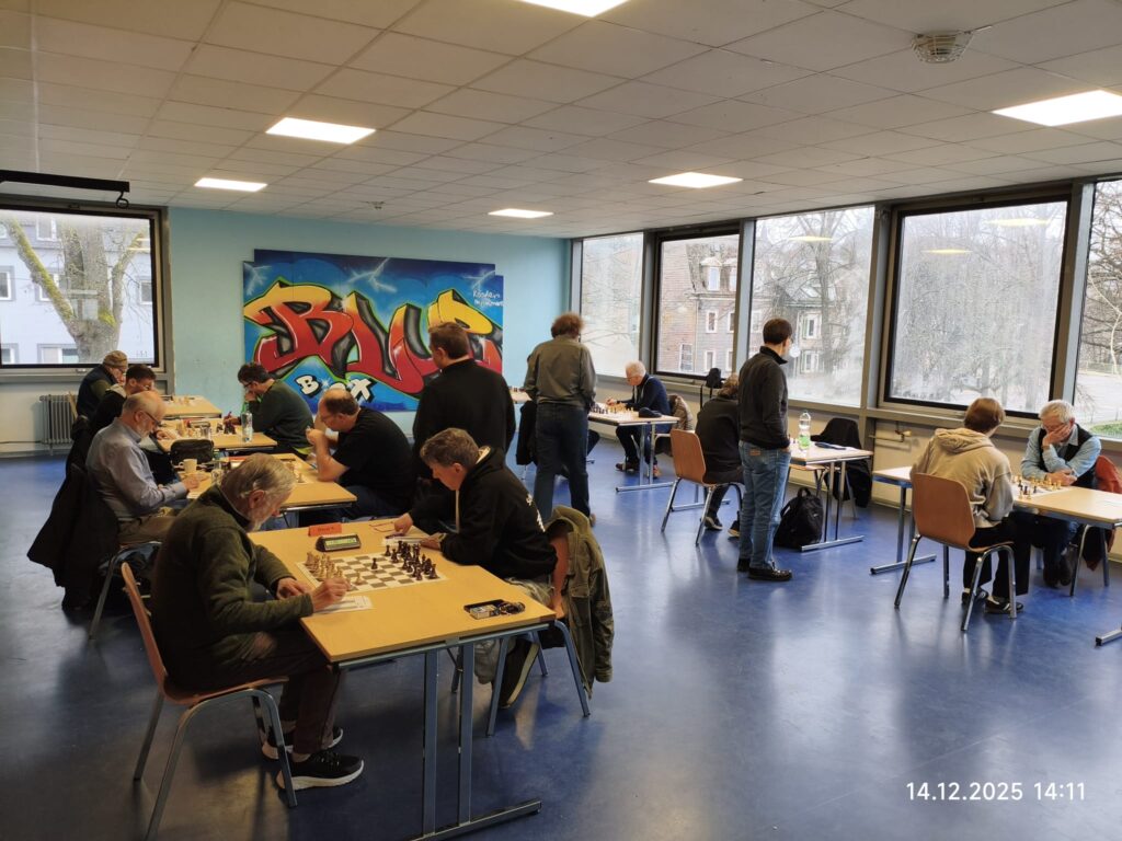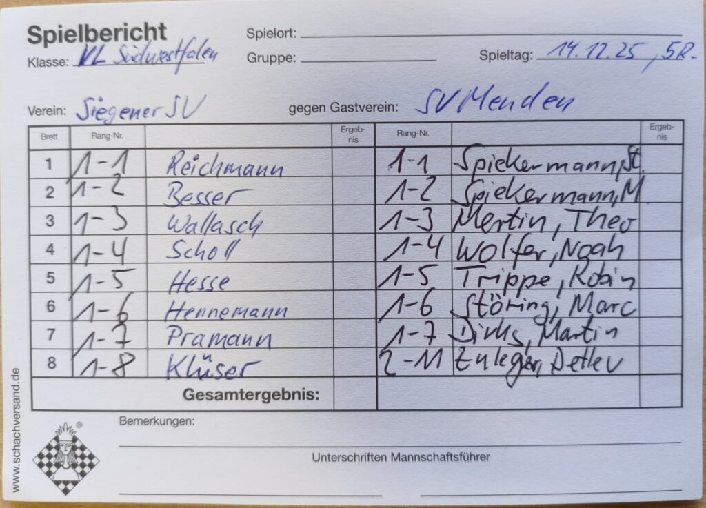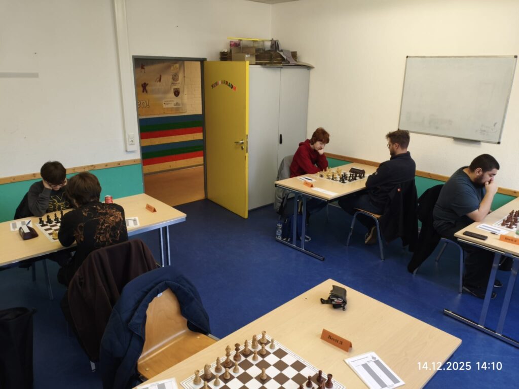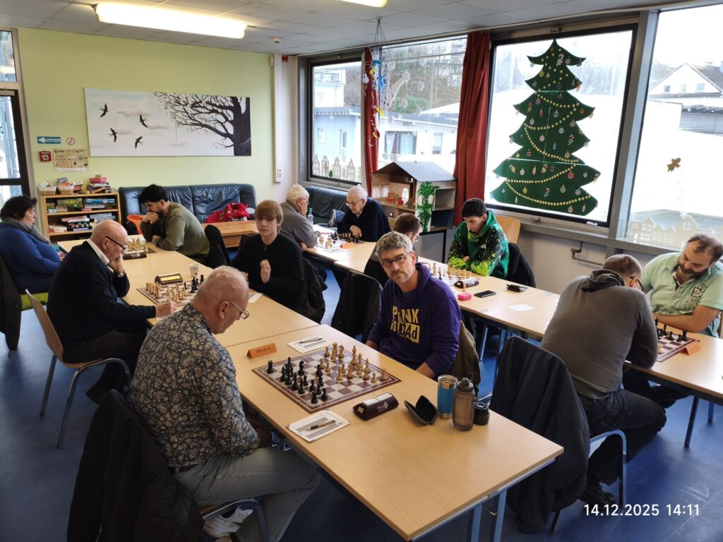 Am 14.12.25 ging es für unsere zweite Mannschaft zu Hause gegen die Zweite von Kreuztal. Einen sehr schnellen Sieg konnte als Erster am letzten Brett Firat gegen seine Gegnerin einfahren. Wenig später gewann Matthies am fünften Brett gegen seinen Gegner. Der Materialunterschied war zu groß, weshalb Matthies den Sieg sicher stellte. Danach gewann Sven am ersten Brett souverän. Nach und nach wurde der Angriff von ihm stärker, weshalb er mit einem Schachmatt gewann. Danach gewann Daniel am vierten Brett. Die bessere Stellung mit einem leichten Materialvorteil für Daniel war schon früh zu erkennen. Danach verlor Andrej am zweiten Brett nach einer langen ausgeglichenen Partie. Andrej tauschte nach einer 0,0 Stellung die Damen, was zu einem deutlichen Stellungsnachteil führte und er schließlich verlor. Zum Schluss spielte Günter nach einer langen ausgeglichenen Partie am dritten Brett Remis. Damit gewann unsere “zweite Welle” mit 4,5 zu 1,5. Mit dem Abstieg hat unsere Zweite nichts mehr zu tun und hat damit die Klasse gesichert. Der nächste Gegner ist Gosenbach am 11.01.2026.