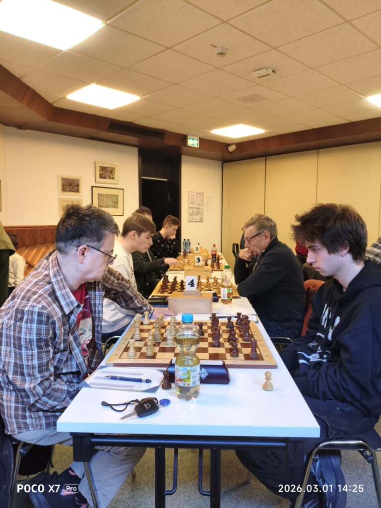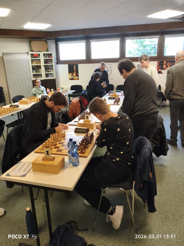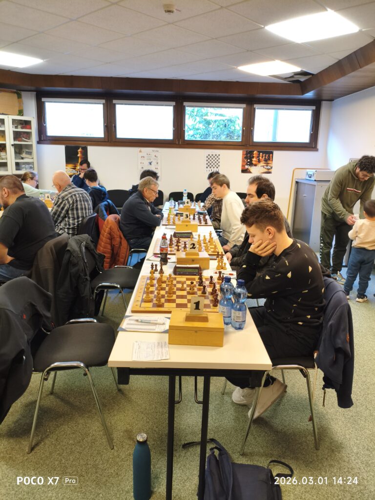 Nico und sein Gegner spielten relativ zügig. Nach einer Stunde übersah Nico plötzlich ein Matt, sodass er aufgab. Jens spielte ausgeglichen. Nach der Eröffnung zog er den falschen Läufer und verlor im Anschluss 2 Bauern. Dieser Nachteil zog sich lange hin, konnte aber durch Platzieren der übrigen Bauern im Spiel unterschiedlicher Läuferfarben ausgeglichen werden. Man einigte sich im Anschluß auf remis. Wolfgang spielte schon zu Beginn voll auf Angriff. Im weiteren Spielverlauf verlor er allerdings Bauern und sein Gegner wickelte geschickt ins Endspiel ab. Durch den Abtausch der letzten Offiziere konnte er die Bauern seiners Gegners dauerhaft nicht mehr aufhalten und verlor die Partie. Volodymir kämpfte am letzten Brett lange mit Qualität weniger aber mehr Bauern im Zentrum. Durch geschickten Abtausch schaffte es sein Gegner einen seiner beiden Bauern auf der Aussenlinie durchzubringen und umzuwandeln. Danach konnt er leider nichts mehr ausrichten und gab auf. Endstand 0,5:3,5